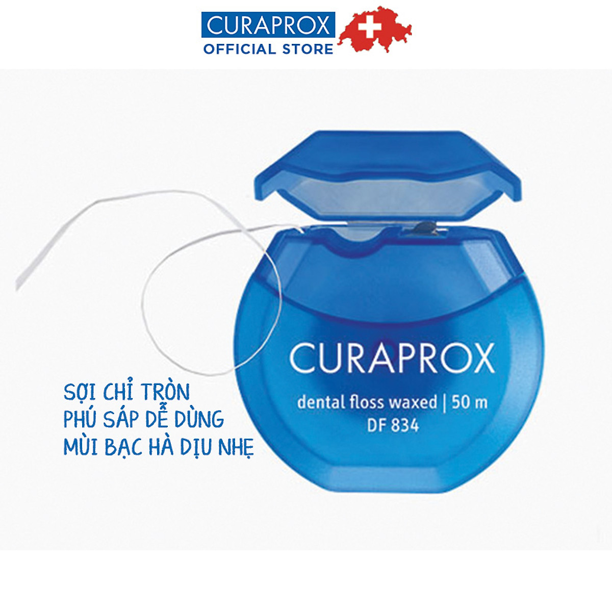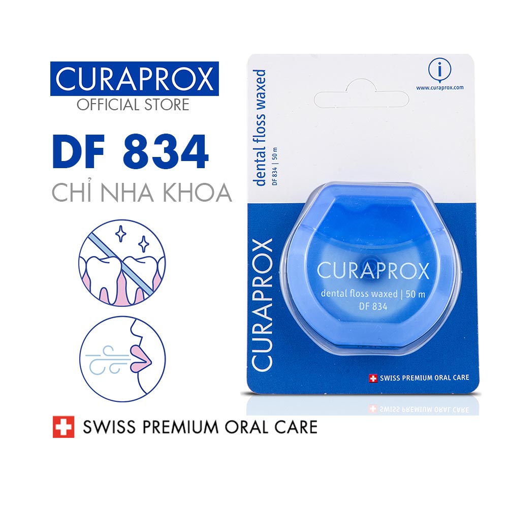 Chỉ nha khoa Curaprox DF 834 có sáp 50m. Sợi chỉ tròn, dai, không bị tưa sợi khi dùng, chỉ có mùi bạc hà dịu nhẹ và được phủ lớp sáp mỏng giúp tránh trơn trượt khi đưa chỉ vào kẽ răng không đúng cách gây xước hay tổn thương nướu. Vì vậy có thể lần đầu sử dụng bạn sẽ thấy không quen vì chỉ hơi nhám, nhưng điều này lại giúp tránh tổn thương nướu răng cũng như tăng hiệu quả làm sạch mảng bám.